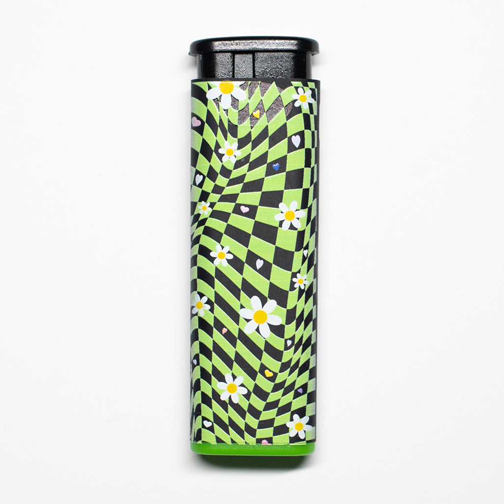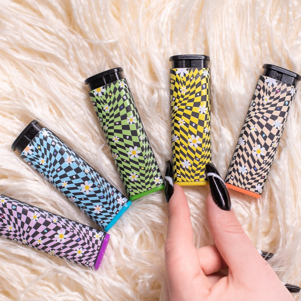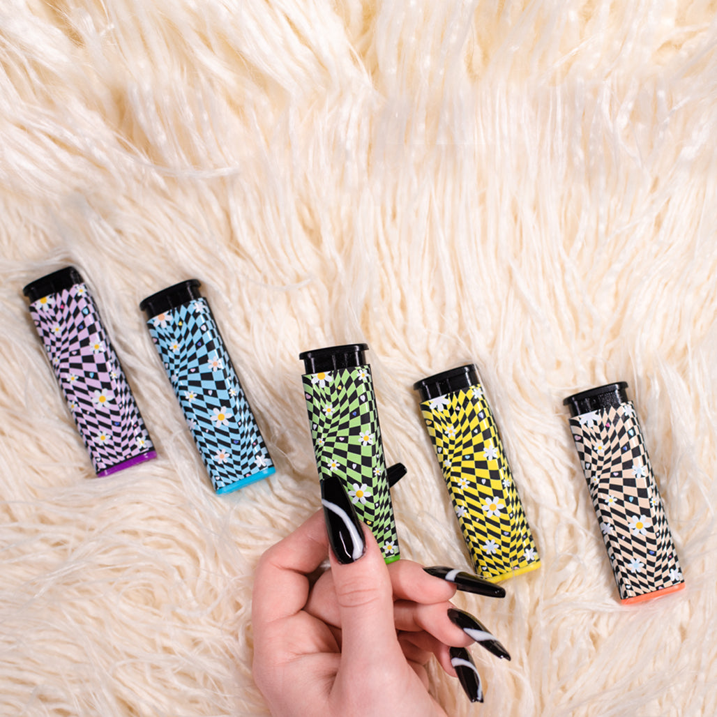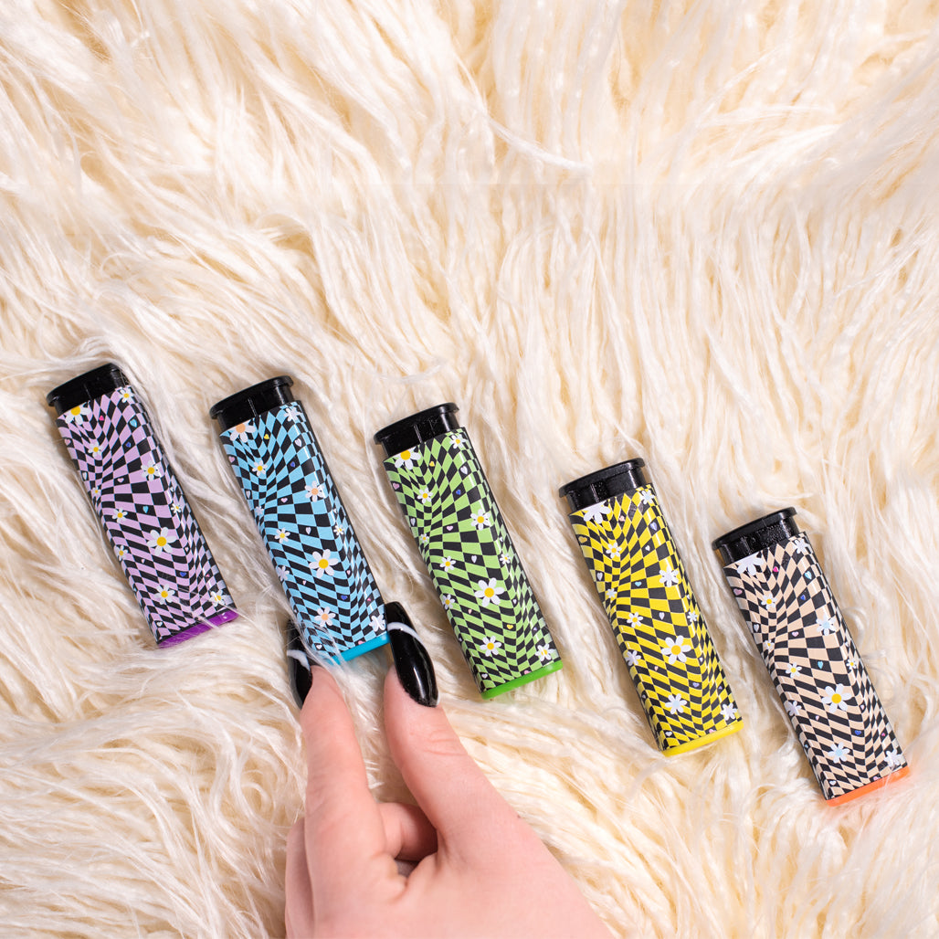 Comes with five, Daisy Printed Cannabitches Lighters, one in each rim color. The design is printed on both sides of each lighter.