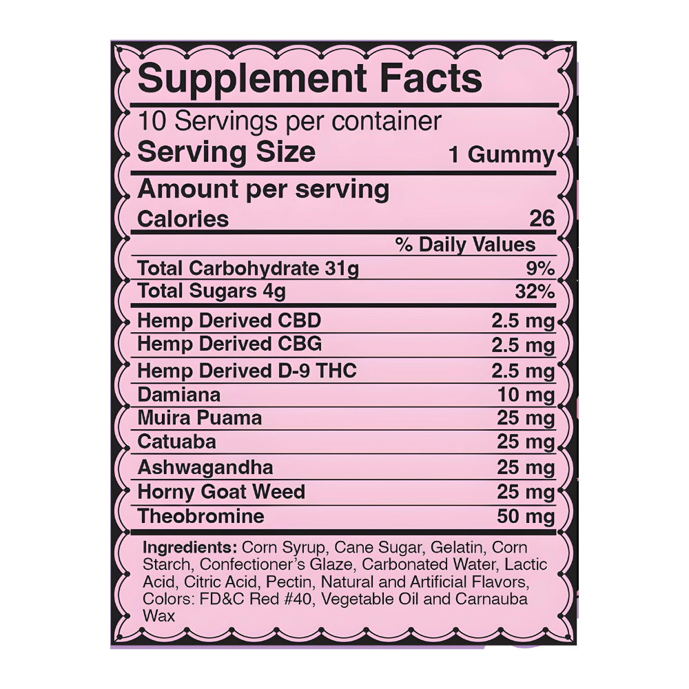 Dosage per Gummy: 10mg Damiana25mg Muira Puama25mg Catuaba25mg Ashwagandha25mg Horny Goat Weed50mg Theobromine2.5mg CBD2.5mg D92.5mg CBG Ingredients: Corn Syrup, Cane Sugar, Gelatin, Lactic Acid, Citric Acid, Pectin, Natural and Artificial Flavors, Colors: FD&C Red #40, Vegetable Oil and Carnauba Wax