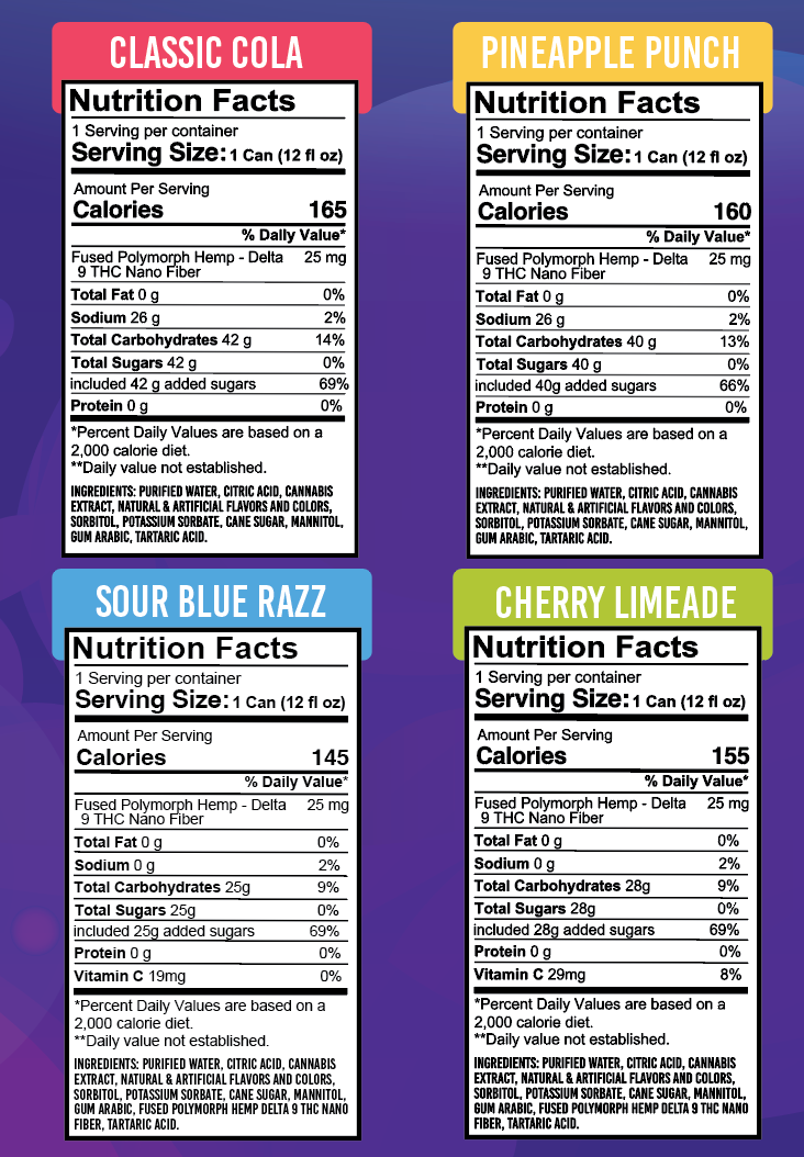 25mg D9 THC per Can Ingredients: Purified water, citric acid, cannabis extract, natural & artificial flavors and colors, sorbitol, potassium sorbate, cane sugar, mannitol, gum arabic, tartaric acid.