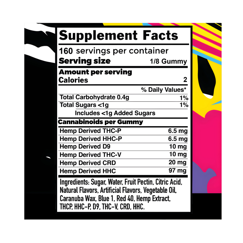 Ingredients: Sugar, water, fruit pectin, citric acid, natural flavors, artificial flavors, vegetable oil, carnauba wax, blue 1, red 40, hemp extract, THCP, HHC-P, THC-V, CRD, HHC.