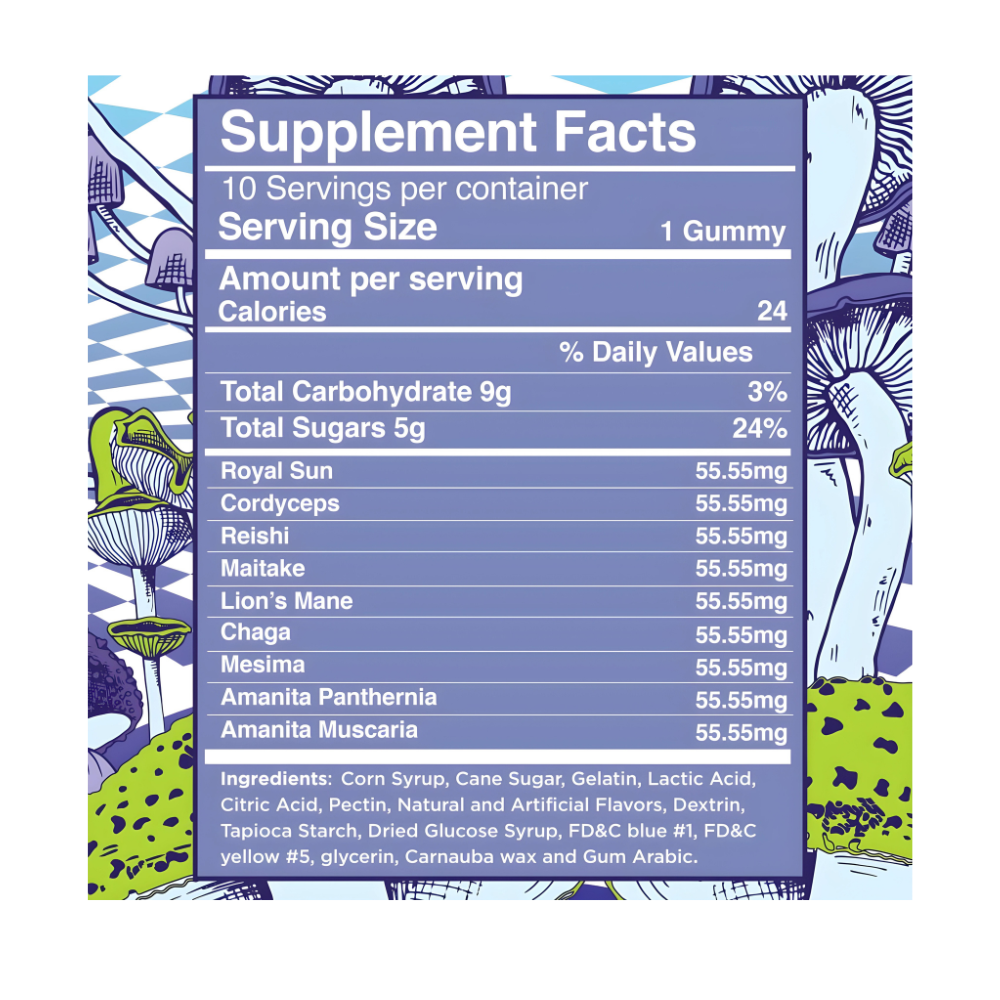 Contains a blend of Royal Sun, Cordyceps, Reishi, Maitake, Lion’s Mane, Chaga, Mesima, Amanita Pantherina, and Amanita Muscaria mushrooms.
